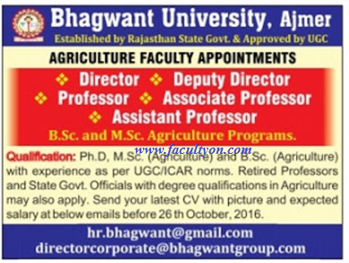 Bhagwant University, Ajmer has advertised in THE TIMES OF INDIA newspaper for the recruitment of Professors Plus Associate Professors Plus Assistant Professors Plus Director Plus Deputy Director jobs vacancies. Interested and eligible job aspirants are requested to apply on or before 26th October 2016. Check out further more details below.
