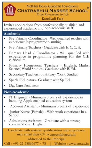 Chatrabhuj Narsee School, Kandivali has advertised in THE TIMES OF INDIA newspaper for the recruitment of Teachers jobs vacancies. Interested and eligible job aspirants are requested to apply by earliest. Check out further more details below.