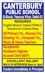 Canterbury Public School, Delhi has advertised in THE HINDUSTAN TIMES newspaper for the recruitment of Teachers PRT plus NTT jobs vacancies. Interested and eligible job aspirants are requested to appear walk-in immediately on working days from 05th September 2017. Check out further more details below.