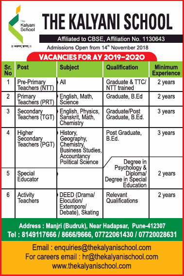 The Kalyani School, Pune has advertised in THE TIMES OF INDIA newspaper for recruitment of Teachers PGT / TGT / PRT / NTT jobs vacancies. Interested and eligible job aspirants are requested to apply as soon as possible from 31st October 2018. Check out further more details below.