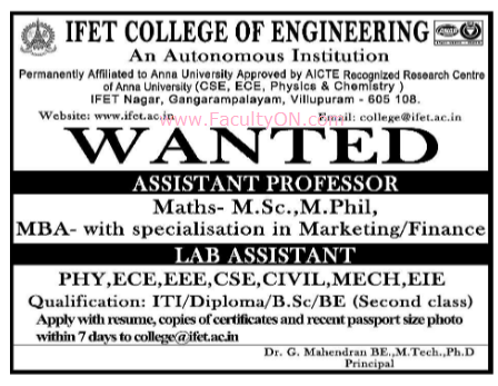 IFET College of Engineering, Villupuram, Tamilnadu has advertised in the Dinamalar newspaper for recruitment of Teachers Job vacancies. Interested and eligible job aspirants are requested to apply within 7 days from 16th July 2019. Check out further more details below.