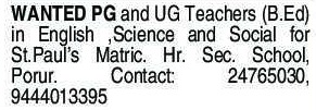 St.Paul's Matric Hr Sec School, Porur has advertised in Newspaper The Hindu for recruitment of Teaching Faculty vacancies. Interested and eligible job aspirants are requested to apply as soon as possible.Check out further more details below.