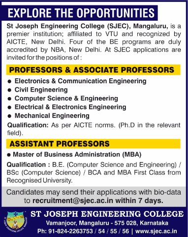 St Joseph Engineering College, Mangaluru has advertised in THE TIMES OF INDIA Newspaper for the recruitment of Professors & Associate Professors / Assistant Professors . Interested and eligible job aspirants are requested to Send to the Mail within 7 days. Check out further more details below.