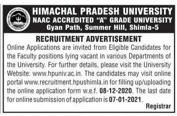 Website: www.hpuniv.ac.in. The candidates may visit online portal www.recruitment.hpushimla.in for filling up/uploading the online application form w.e.f. 08-12-2020.