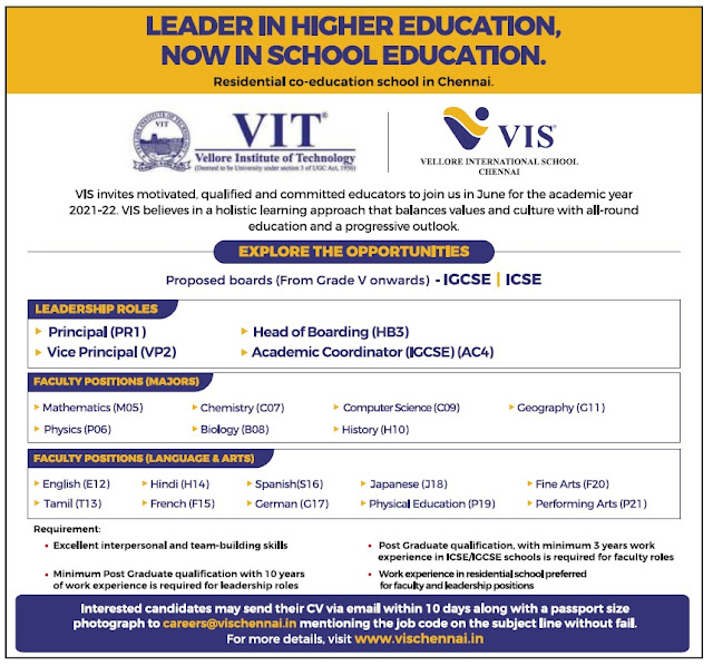 Job Location: Vellore, Tamilnadu[Search tip: Search in Google as FacultyON Tamilnadu to find latest faculty teachers vacancies in Vellore city alone]