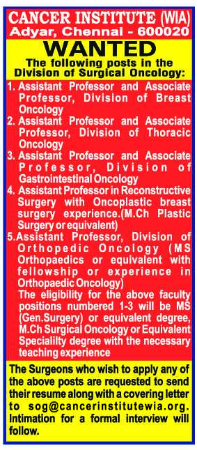 About Institution: The Cancer Institute (WIA), also known as the Adyar Cancer Institute, is a non-profit cancer treatment and research centre based in Chennai, Tamil Nadu. The Cancer Institute (WIA) was established in the year 1954 under the leadership of Dr. Muthulakshmi Reddy..